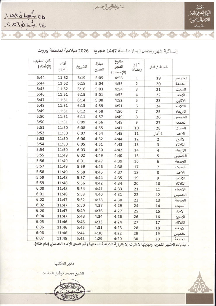 امساكية شهر رمضان المبارك 2026 م- 1447 هـ